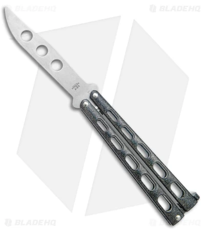Bear & Son butterfly knife features a stainless steel trainer blade with a tough epoxy coating over its durable steel handles. The handles feature a skeletonized design to reduce weight.