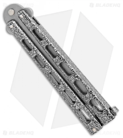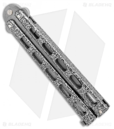 The 114A is another great looking Bear Butterfly knife. This knife features a tough silver vein (textured silver paint over a black base) epoxy coating over the zinc handles. The handles also feature a skeletonized design to reduce weight. The stainless steel tanto blade is finished with a matte bead-blast look and has a plain chisel ground edge. Single tang pin. These knives are pretty rugged and will hold up to some abuse PLUS they are made in the USA!