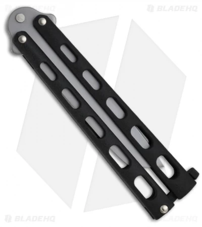 Bear and Sons manufacture quality butterfly knives. This knife features a tough black epoxy coating over zinc handles. The handles feature a skeletonized design to reduce weight. The Tanto-styled stainless steel blade has a plain edge and bead blast finish. Single tang pin construction makes this a nice mid-range butterfly knife. Built in the USA.