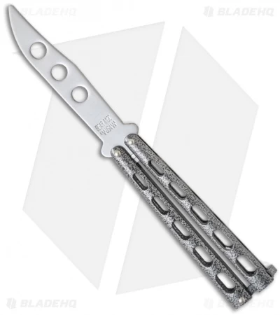 Bear butterfly knife trainer. This trainer knife feature a tough epoxy powder coating over zinc handles. The handles feature a skeletonized design to reduce weight. Stainless steel trainer blade with a satin finish. Single tang pin. A nice USA made mid-range butterfly knife.