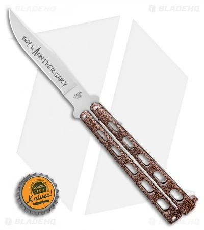 The Bear & Son 115 butterfly knife is built with durable Copper Vein epoxy coated zinc handles with a skeletonized design for reduced weight. It features a 440 stainless steel blade with a satin coating. This is a solid mid-range butterfly knife, made right here in the USA.