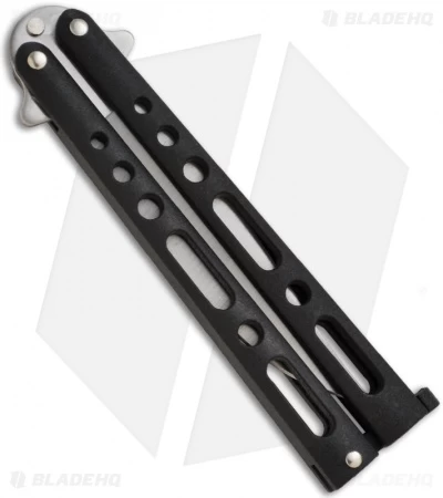 This large Benchmark Black Butterfly knife has a clip point style stainless steel blade with a satin finish. The handles are cast metal and feature channel construction with pins. The handles are extra thick, giving them a heavier weight and solid feel with cutouts for a nice look. The action on this knife is great!