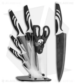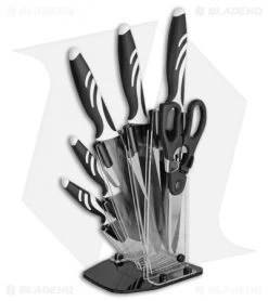 The Benchmark 7-Piece Ceramic Kitchen set is a great addition to any kitchen! Black titanium coated stainless steel blades maintain an extremely sharp edge while black and white rubberized handles provide a comfortable and secure grip. Display your set with the included black knife stand.