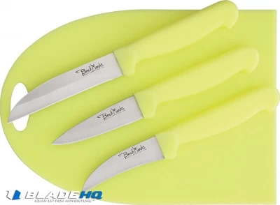 The Benchmark 3-Piece Paring knife set is the perfect addition to any kitchen. Glow in the dark yellow rubber handles are easily visible day or night. Stainless steel blades easily cut through any small kitchen task. Includes neon yellow cutting board (not glow in the dark).
