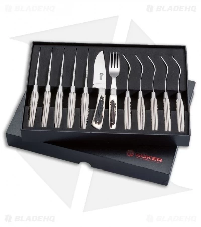 This Stag Steak Knife Dinner Set by Boker Arbolito keeps dinner classy for up to six table settings. Each knife and fork is handmade from full-tang stainless steel and comes outfitted in genuine South American stag over subtle red liners. Comes in a gift box for easy gifting or storage.
