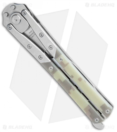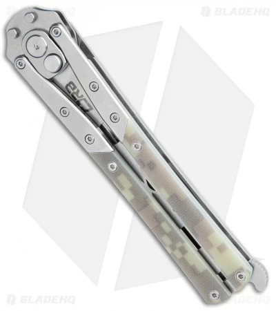 The Automatic Butterfly Tool from CJRB takes the innovative mechanism of the Artisan Cutlery Kinetic Tool to a more accessible price point. It’s a balisong, but it’s also an automatic. If you want it to only be an auto for a while, you can latch the handle from the top, securing the handles together. The dull trainer blade has a bottle opener.