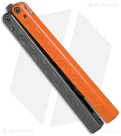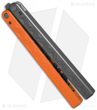 This Desert Orange balisong trainer features a black blade with orange and black handles.