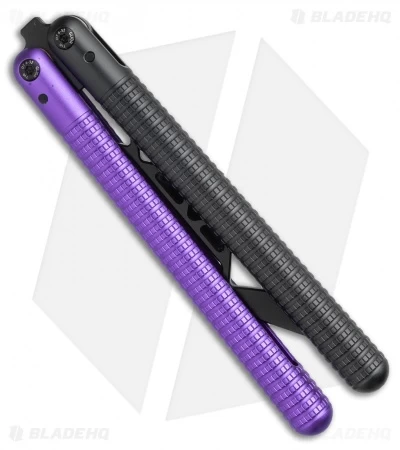 This SAHARA balisong trainer features a black blade and black and purple handles.