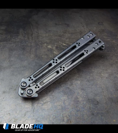 This Basilisk Elite production model features black PVD coated titanium handles with a skeletonized hole design and horizontal jimping. It has a bowie style blade with a recurve edge and a black coating to match the handles. The knife comes outfitted with PVD coated hardware, spacers, and latch.