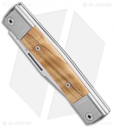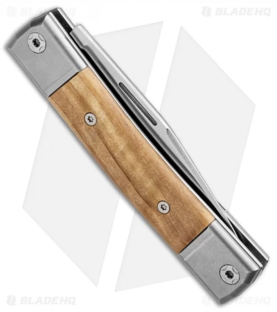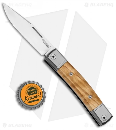 This model of the LionSteel BestMan sports a satin clip point blade made from Bohler M390. The titanium handle has olive wood inlays with titanium bolsters.
