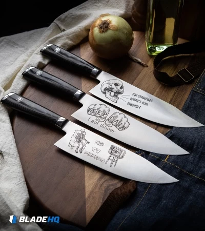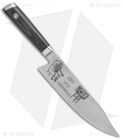 This Production Bowie Chef has an 8″ blade made of stainless steel-clad VG-10 and a black micarta handle. The blade is engraved with a unique “No TV Dinner” graphic.