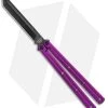 The latest generation of the Tachyon butterfly knife, the production Microtech Tachyon III, distinguishes itself from previous models with milled, single-piece channel construction handles, a spring latch, and a standard pocket clip. The blade showcases a non-sharpened swedge-ground tip and milled grooves with the Microtech logo, production date, and blade steel markings up front.