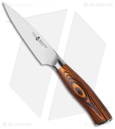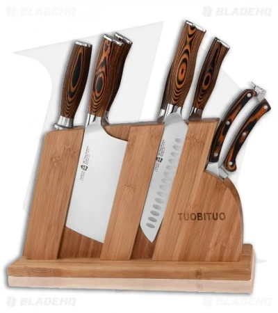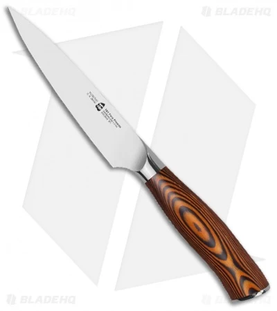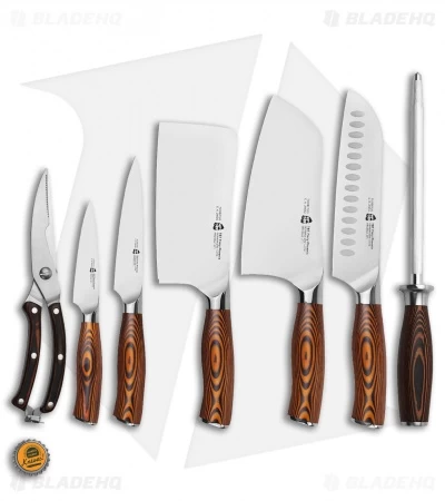 The Tuo Fiery Phoenix line stands out with bold style and excellent cutting capability. Each knife features orange and black pakkawood handles that are shaped for comfort. Their German stainless steel blades come wicked sharp, ready to process whatever food you need them to.