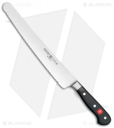 - 10″ blade with scalloped serrations made for slicing large chunks of meat and more delicate foods without crushing them.