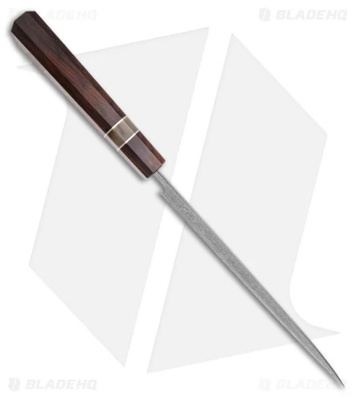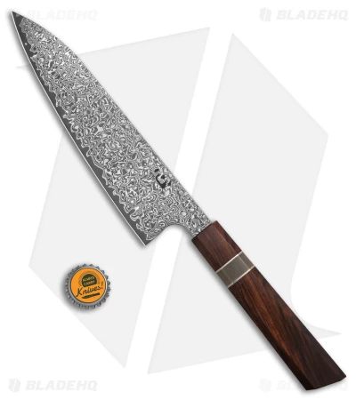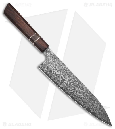 The Xin Cutlery XinCraft Octagonal 9″ Chef Knife combines beauty and functionality in a wonderful way. It has a Damascus steel blade with a VG10 steel core, giving it great edge retention and sharpness. Its handle employs a stunning combination of materials: rosewood, buffalo horn, and nickel silver. The knife is something to behold, but make no mistake: it will cut like a champion in kitchen.