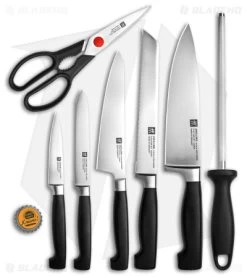With all the essentials, the Zwilling Four Star 8-Piece Knife Set is the perfect way to start your kitchen collection. These knives are forged from ice-hardened stainless steel for sharp, hard blades and no rust. The Four Star series features attractive full steel bolsters to achieve that professional pinch grip when chopping vegetables. The polypropylene handles are ergonomically formed to fit your hand comfortably. Upgrade your kitchen knives with the Zwilling Four Star set!